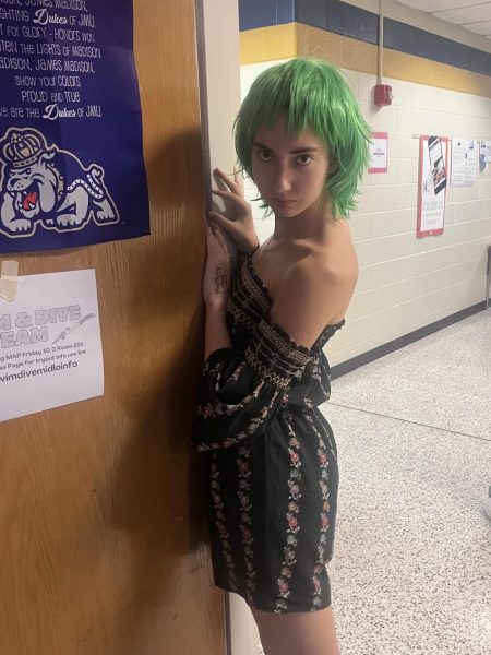 Lucy Wieber (grade 11) also rocked a bold wig on Wednesday, expressing she has been “thinking about changing [her] hair recently and…wanted to do something drastic” since she has never dyed her hair before. She wanted to get a taste of the experience of non-natural hair by “[going] crazy”, as she described it, with a fluorescent green wig.