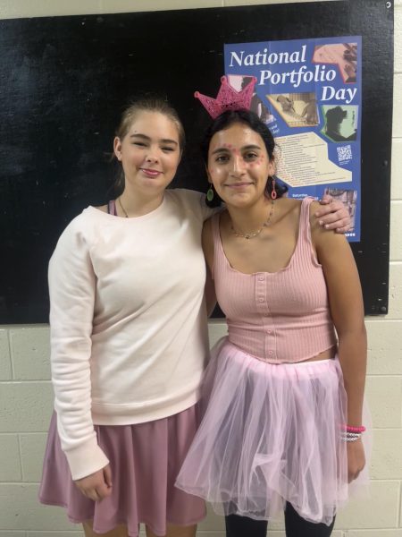 I conversed with Amaya Nicole Ralph (Left, 9) and Nedah Pompello (Right, 9). Amaya told me that she put pink butterfly clips in her hair for the day, and Nedah reported reusing of multiple items in her ensemble, specifically her tutu and tiara, from the 8th grade pink out day last year. She also spoke about her face paint, describing how she does it “whenever we have a spirit day.”
